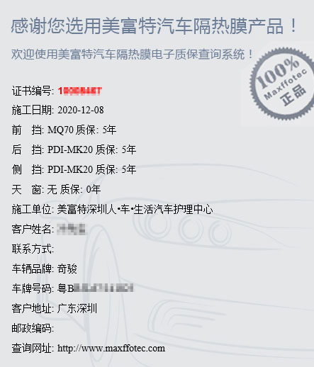 美富特擁有完善的汽車膜質(zhì)保體系,產(chǎn)品一經(jīng)授權(quán)經(jīng)銷商和4S店安裝就能獲得不同年限質(zhì)保,保證質(zhì)保期內(nèi)產(chǎn)品無破損、