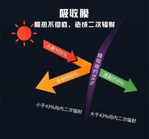 是在膜上添加了吸熱劑,猶如一塊海綿吸收約86%的熱量,吸熱飽和后,溫度飆升,造成第二次輻射。熱量不斷傳向車內(nèi),此時(shí)您愛(ài)車的空調(diào)負(fù)荷不但沒(méi)有減輕,反而是超負(fù)荷運(yùn)作,油耗飆高。