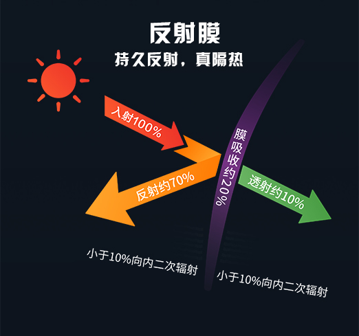 采用先進(jìn)的磁控濺射工藝將金、銀、鈦、鎳、銦等貴金屬均勻?yàn)R射到PET基材上,就像一面鏡子,能夠反射大約70%的紅外熱量,持久隔熱,令您的車廂清爽愜意。